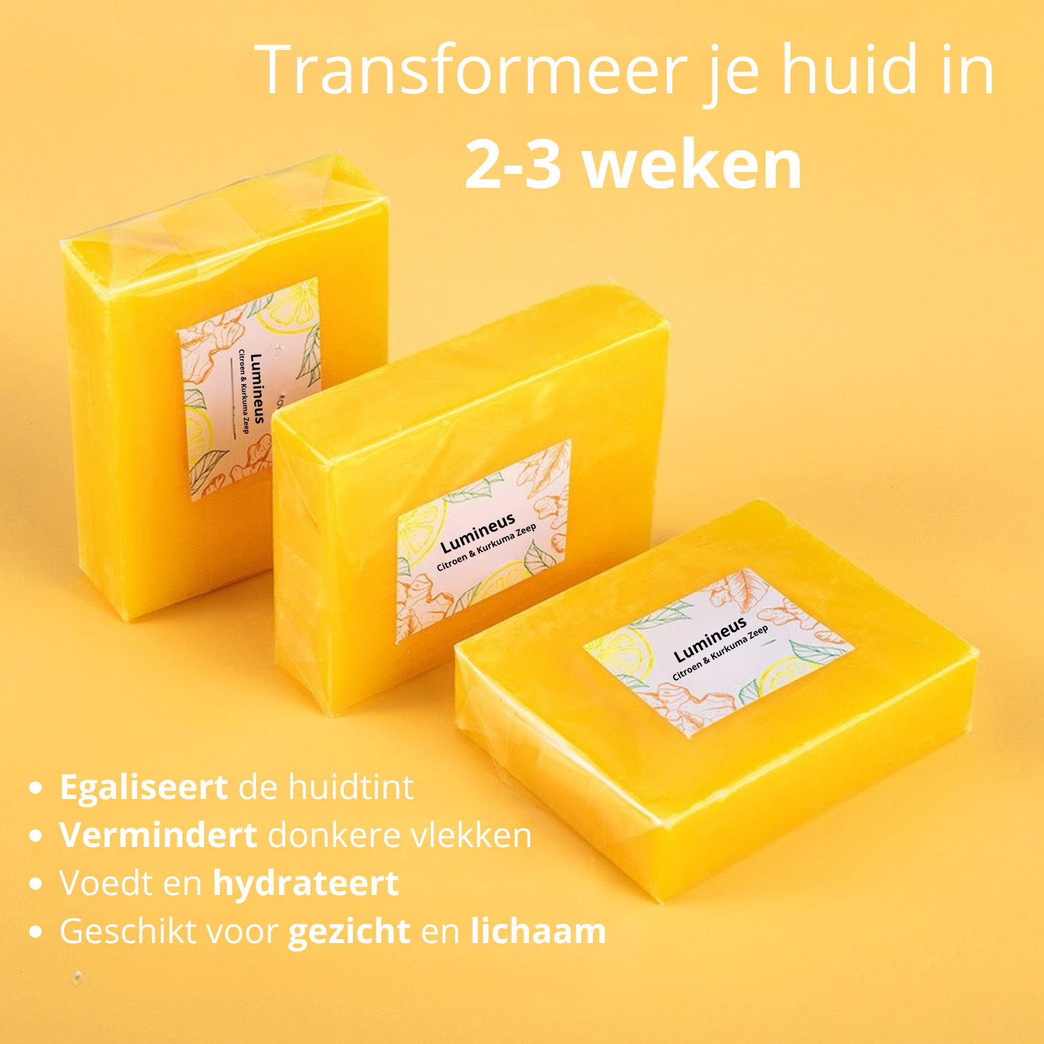 Dagelijkse blootstelling aan vuil en talg verstopt je poriën, wat leidt tot puistjes en een doffe huid. De Lumineus Citroen & Kurkuma Zeep reinigt diep, terwijl kurkuma ontstekingen kalmeert en citroen bacteriën tegengaat. Het resultaat? Een frisse, stralende huid zonder agressieve behandelingen.